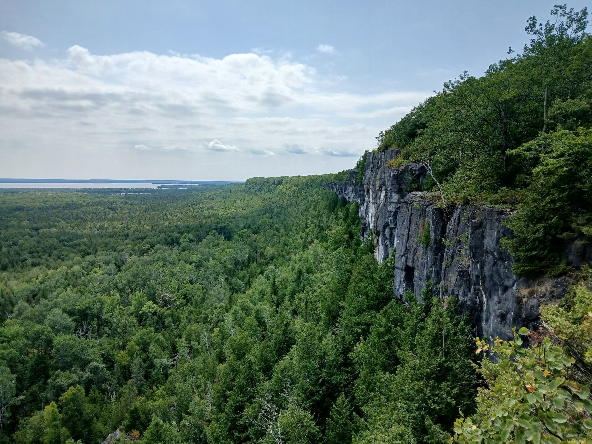 The GTMTB Assistant timed it perfectly — a morning start for shade on the climb and fewer crowds at the summit. The trail winds through forest and limestone ledges before opening up to jaw-dropping views of La Cloche Mountains and endless Manitoulin farmland below.